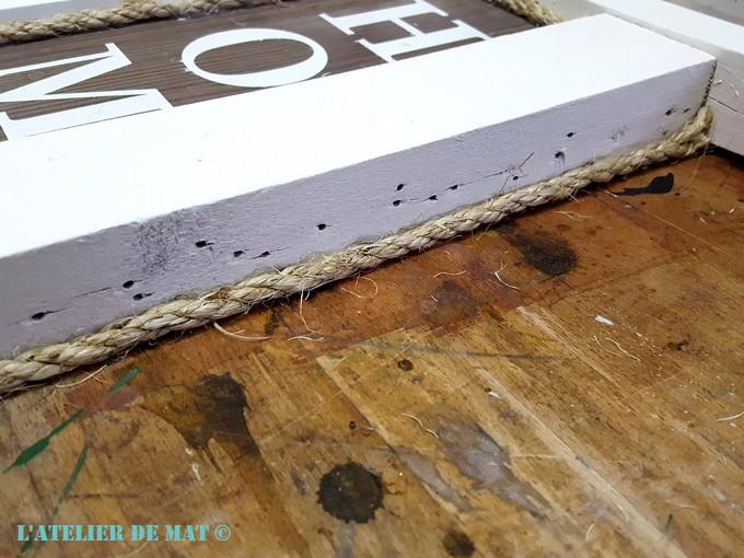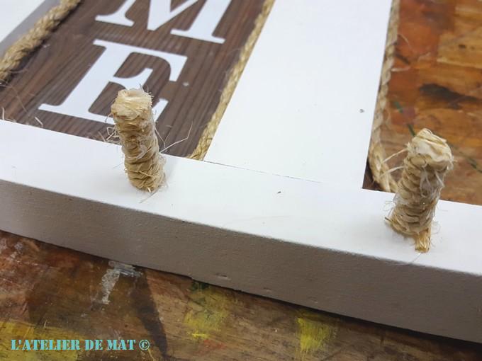 Plutôt que d’utiliser un mastic ou de la pâte à bois, j’ai pensé que de coller de la corde en chanvre ferait plus sympa pour cacher les trous de clous.