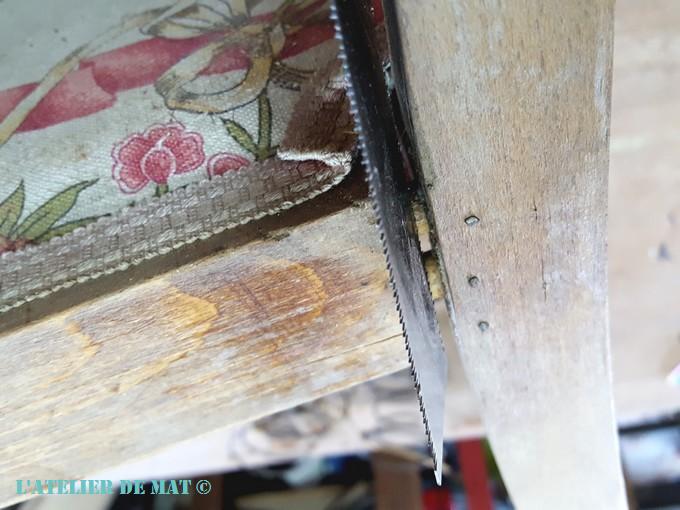 Deuxième étape : séparer le dossier de l’assise. La solution la plus simple pour cela a été de scier les tourillons de chaque coté.