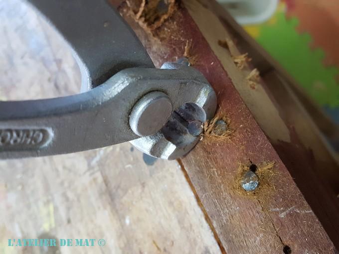 Pour retirer tous les clous restants sous l’assise, j’ai utilisé une paire de tenailles. Si vous n’en avez pas vous pouvez toujours essayer avec un autre type de pinces mais ca vaut vraiment le coup d’investir (ça coûte environ 10€) car c’est le mieux pour retirer des vieux clous.