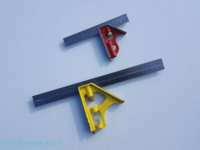 J’en possède deux de différentes tailles. Avec cet outil, on peut contrôler l’équerrage lorsque l’on fixe une planche bien sûr; ou tracer un trait à 45 degrés aussi, mais il a des fonctions supplémentaires géniales. J’adore le temps qu’il me fait gagner. Vous connaissez la galère que cela peut être de mesurer pour poser des poignées sur un tiroir, et bien là c’est un jeu d’enfant. Si j’ai un tiroir qui fait 15 cm de haut par exemple, je règle l’équerre à 7,5 cm et je n’ai plus qu’a tracer ma ligne pour avoir la bonne hauteur. En répétant l’opération à partir des bords je sais exactement où percer pour poser ma poignée ! Elles me servent aussi pour contrôler que des glissières de tiroirs sont toutes alignées avec le même retrait, comme lorsque j’ai dû le faire lors de la restauration de ce bureau. C’est un outil qui regroupe équerre, niveau, trusquin et jauge de profondeur. Pas mal non? Une chose est sûre, l’essayer c’est l’adopter !