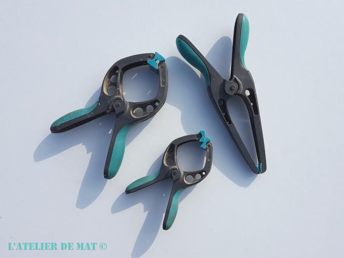 Je bricole souvent seul à l’atelier et j’ai parfois besoin d’une troisième voire d’une quatrième main. L’outil ultime pour cela c’est la pince à ressort. J’en ai un rack collé à mon établi pour les atteindre rapidement. Ca n’abîme pas le bois, comme pourrait le faire un serre joint, et ça maintient vraiment bien. Comme cela existe en différentes tailles et formes, j’en ai un assortiment. Pour avoir eu des pinces du style en premier prix, j’ai finalement opté pour la marque Wolfcraft car ça pince fort. Du coup je m’en sers aussi pour les collages délicats comme sur des cadres de miroir.