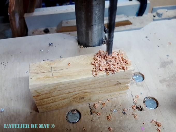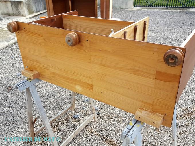 Avant d’attaquer la peinture, je voulais fixer un petit détail qui me gênait. Quand j’ai dû soulever ce meuble pour le mettre dans la voiture il a basculé. Je croyais qu’il lui manquait un pied mais en fait non. Il a seulement deux pieds avant et un seul a l’arrière. Bizarre et pas terrible. Pour pallier cela, je me suis lancé dans la fabrication de deux pieds arrières. Je les ai fait simples. Dans un tasseau, j’ai coupé deux morceaux de 12 centimètres de long environ et j’ai percé deux trous dans chaque. Les trous ne vont qu’à la moitié de l’épaisseur ce qui permet de cacher la vis et d’utiliser aussi des vis plus courtes.