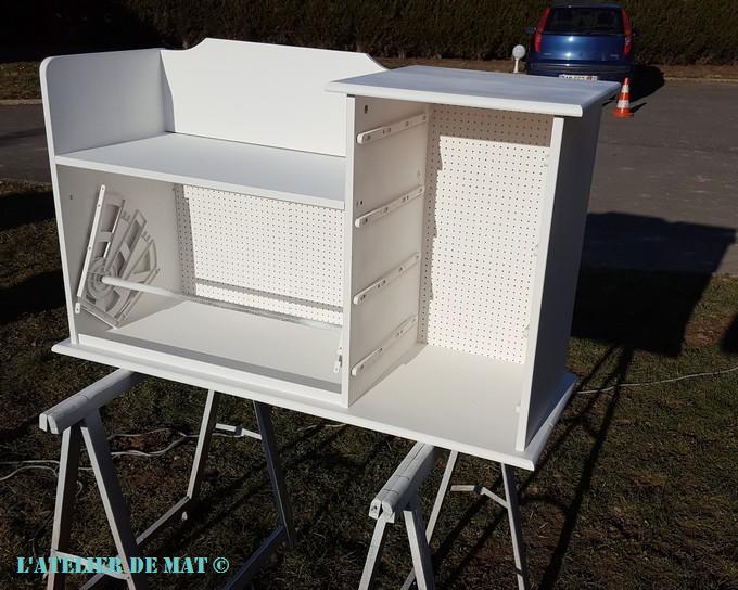 Je ne vais pas repeindre les éléments du compartiment à chaussures, les planches sont en mélaminé et le mécanisme en plastique. Avec le frottement des chaussures cela ne tiendrait pas à la longue et je n’ai pas envie d’investir dans un apprêt spécial juste pour ça.