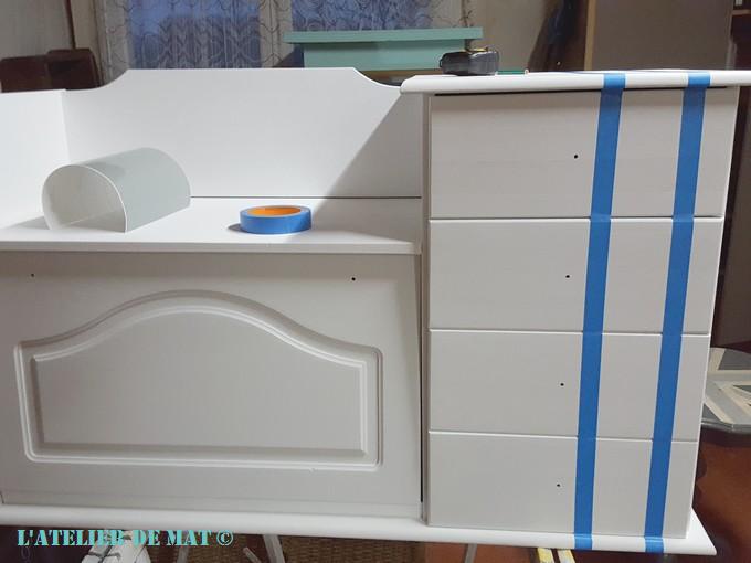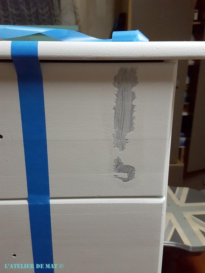 Jusque là tout allait bien, le projet avançait comme prévu. Une fois la peinture sèche, l’idée était de faire une bande verticale de couleur sur les tiroirs pour couper tout ce blanc. Pour faire cela j’utilise du scotch 3M que j’avais acheté pour le guéridon britannique. C’est un scotch vraiment bien car il se décolle et se recolle facilement.