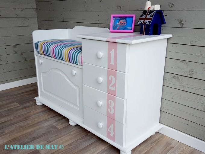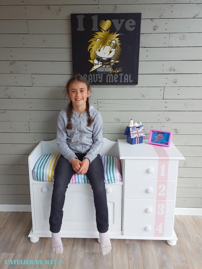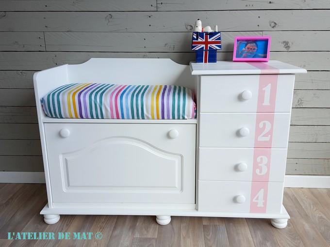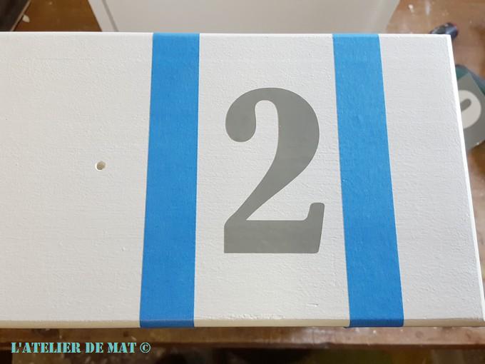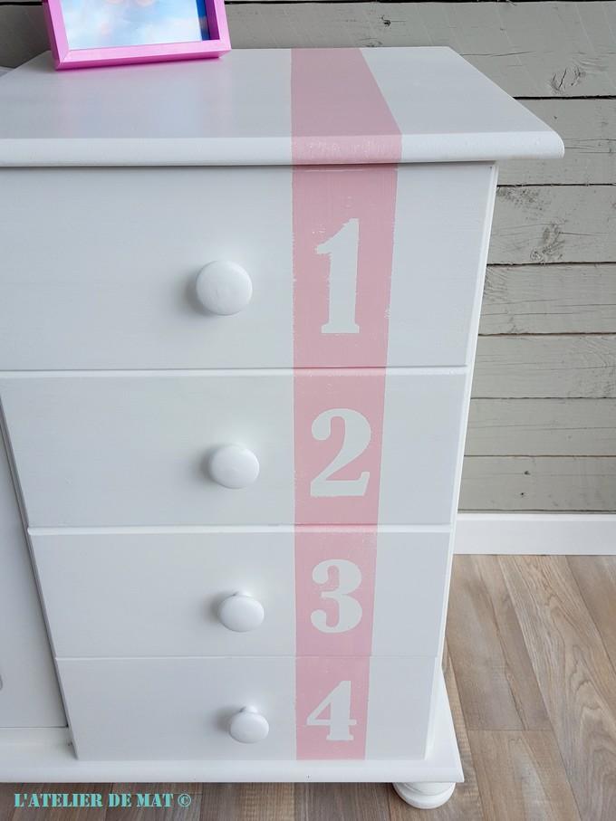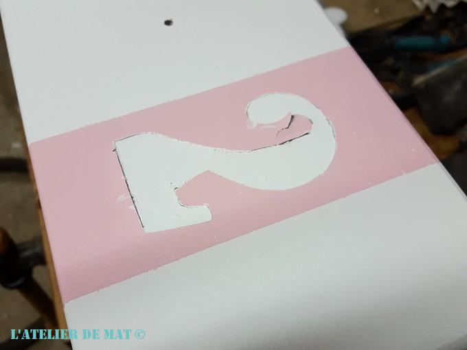 Toute une partie de la peinture est restée collée au scotch! Après 4 couches de peinture pour combler le manque, ça ne le faisait vraiment pas. J’ai donc fini par décaper et repeindre tout le tiroir. Il ne me restait alors plus qu’à appliquer sur chaque tiroir un sticker afin de les numéroter. Ainsi une fois la couche de rose appliquée, et oui Eireen a choisi le rose comme couleur de la bande (quelle surprise hein ;)), il n’y aura plus qu’à enlever le sticker pour avoir un chiffre en blanc. L’idée a été simple à réaliser mais quand j’ai enlevé le sticker sur le tiroir n°2, bam ! Deuxième grosse tuile: