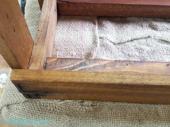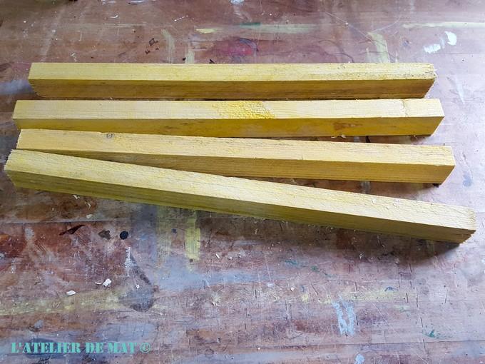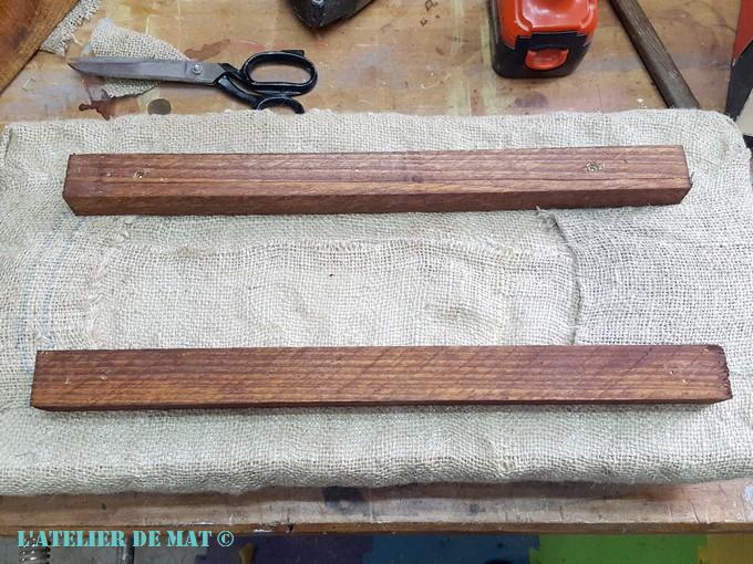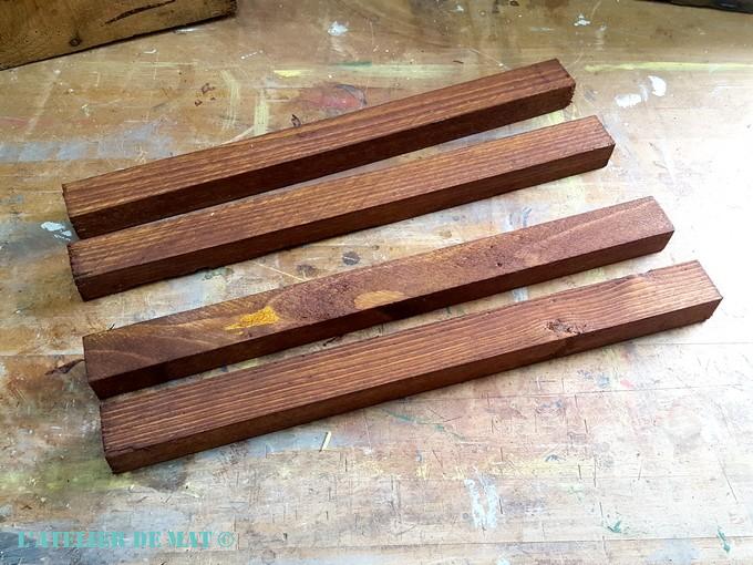 Seule la couleur jaune due au traitement n’était pas à mon goût. Avec un peu de teinte couleur « Teck » le problème a vite été résolu. À noter que je n’ai pas poncé les tasseaux afin de garder un aspect un peu brut comme le style des caisses.