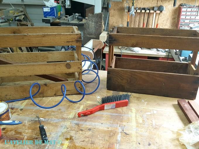 Dans le petit pot rouge j’ai mélangé environ 2 cuillères à soupe de cire que j’ai diluée avec la même quantité d’essence de térébenthine. Une fois le tout assez homogène j’ai ajouté une grosse dizaine de cuillère à soupe d’huile de lin et j’ai secoué. Je me suis servi d’un pinceau pour appliquer le tout. C’était assez long car le bois a beaucoup bu et je devais en permanence recharger le pinceau. À titre d’information, j’ai passé un pot et demi de mixture par caisse. Ci-dessous la différence entre la caisse de droite qui est faite et celle de gauche qui attend son tour.