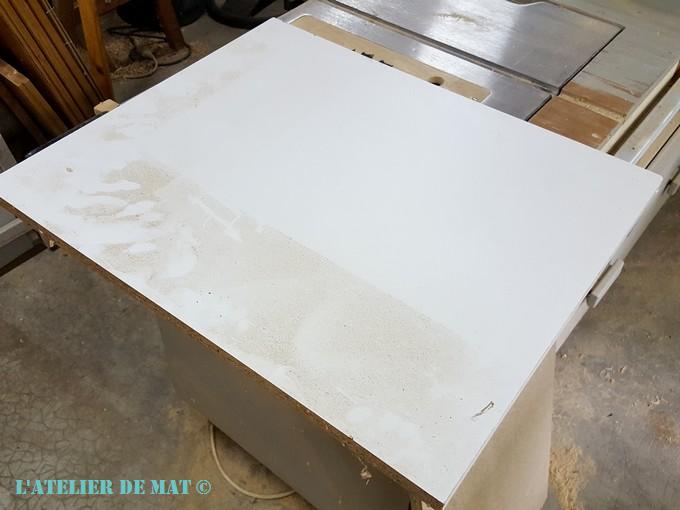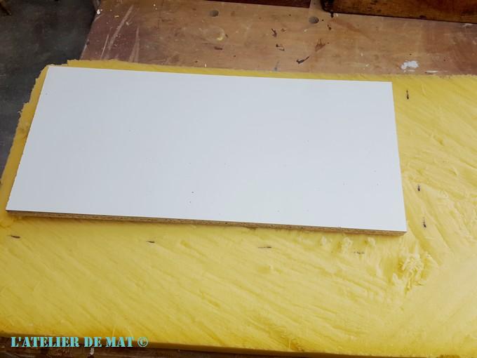 L’assise étant entièrement recouverte, je ne voulais pas utiliser de bois brut ou de panneaux dont je pourrais avoir besoin pour un autre projet. C’est à ce moment là que je me suis souvenu que j’avais des chutes assez grandes de mélaminé qu’on m’avait donné. J’ai même trouvé la chute parfaite car je n’ai eu qu’à la couper en deux pour obtenir les assises.