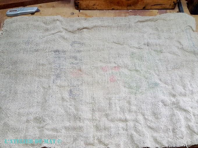 Il y a peu, j’ai pu récupérer des sacs en toile de jute. Ils étaient un peu abimés, sales et sentaient un peu fort. C’est là que j’ai eu la mauvaise idée de l’année : je les ai passées à la machine à laver. Vous pouvez constater que ce n’était pas du tout une bonne idée !! Les écritures dessus se sont en partie effacées. Je pensais que c’était imprimé mais à priori cela doit juste être un pochoir. Oups la boulette !! 😉 Mais bon cela n’a pas entamé ma détermination à poursuivre le projet.
