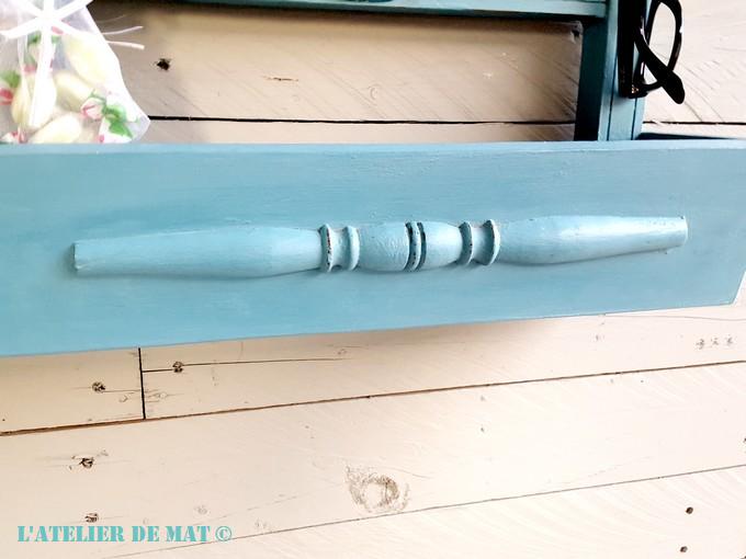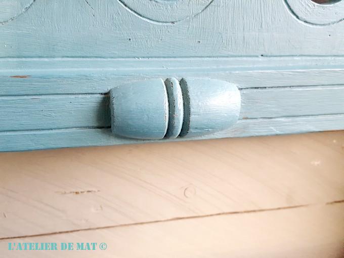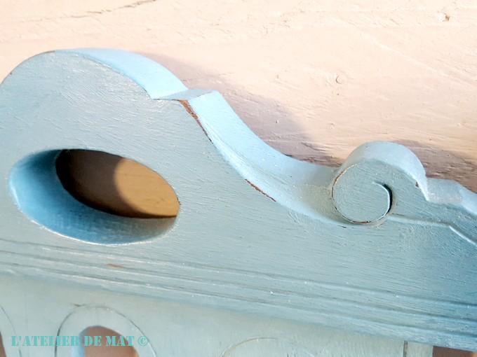 J’ai alors frotté la peinture avec du papier kraft. C’est plus doux qu’un ponçage et cela a eu pour effet aussi, d’amener des nuances dans la couleur avec des zones plus foncées. Pour protéger j’ai ensuite ciré l’ensemble (cire incolore) ce qui a légèrement rehaussé le bleu.