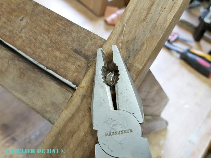 J’ai pu enlever la première sans aucun souci mais la loi du bricolage s’est appliquée pour la deuxième: impossible de bouger la vis. Mais quand on bricole des meubles anciens il faut être débrouillard pour pouvoir avancer et voici ma technique. Avec une paire de tenailles, j’attrape les côtés de la vis récalcitrante, il faut parfois s’y reprendre à plusieurs fois, et ensuite je tourne doucement. Il ne faut pas hésiter à y aller doucement, millimètres par millimètres pour que cela marche bien.