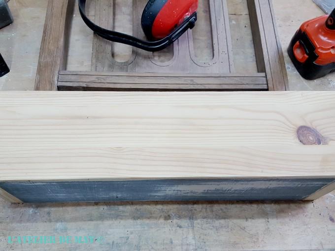 Comme il me restait l’autre moitié du barreau , j’en ai coupé des morceaux que j’ai fixés sur les cotés de la même façon. J’ai ensuite bouché tous les trous laissés par les clous avec du mastic à bois puis j’ai poncé pour avoir une surface propre avant peinture.