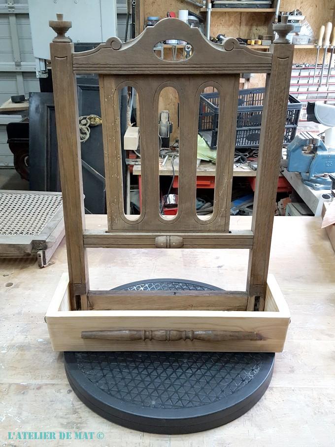 Il y a quelques temps, pour réparer une petite table, une travailleuse pour être précis, j’avais dû « emprunter » les pieds avant de cette chaise et depuis j’avais donc celle-ci qui était suspendue à un crochet de l’atelier. Outre le fait que je commence à manquer d’espace à force, une petite voix dans ma tête m’a convaincu qu’il serait possible d’en faire un truc sympa. Pourquoi pas?