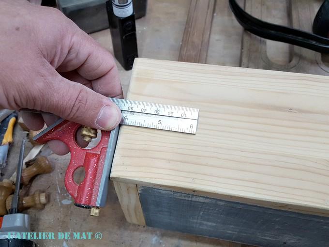 Bref, avec mon barreau déligné en deux, il ne restait plus qu’à le fixer sur la façade. Une astuce pour cela consiste à utiliser une équerre a combinaison(détails ici). On mesure la longueur de la façade a laquelle on soustrait la longueur du barreau puis on divise par deux. Vous suivez toujours? Donc avec une façade de 40cm à laquelle je soustrais un barreau de 29cm on obtient 11cm que l’on divise par deux ce qui permet de régler l’équerre à 55mm.
