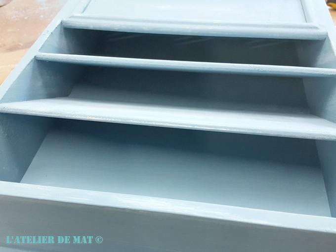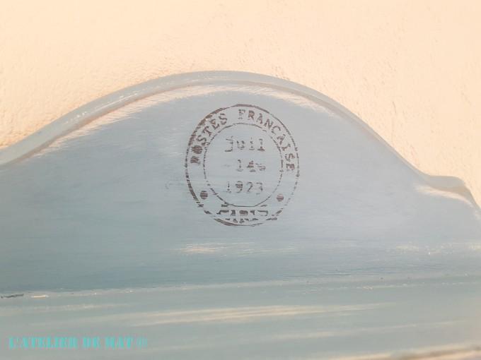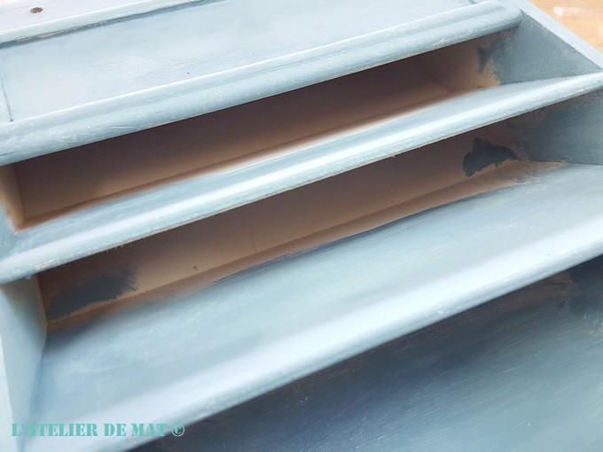 J’ai patiné l’intégralité du trieur en le ponçant par endroit afin de faire ressortir un peu de la couleur d’origine. J’ai aussi « usé » le pochoir afin que cela ne tranche pas avec le reste.