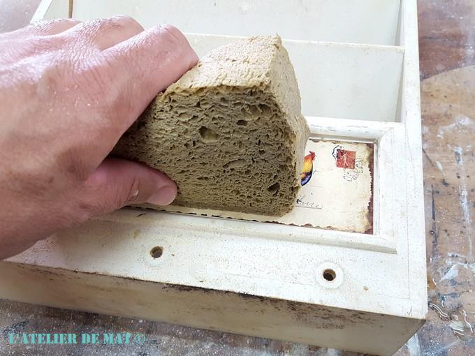 Je me suis armé d’une grosse éponge et j’ai humidifié le papier en faisant attention de ne pas tout détremper non plus. Le trieur étant en MDF (boi composite) , celui ci craint l’eau et pourrait gonfler si jamais il était trop mouillé.