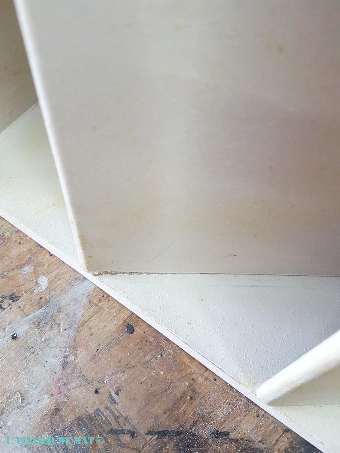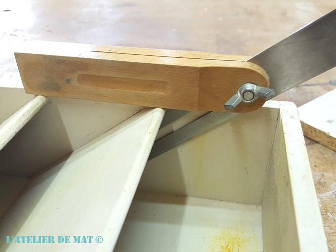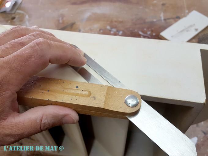 Avec la finesse de la planche et l’angle, la marge d’erreur était faible pour faire une réparation propre. Et c’est là que la fausse équerre rend bien service. J’ai commencé par « copier » l’angle en me servant de l’étagère