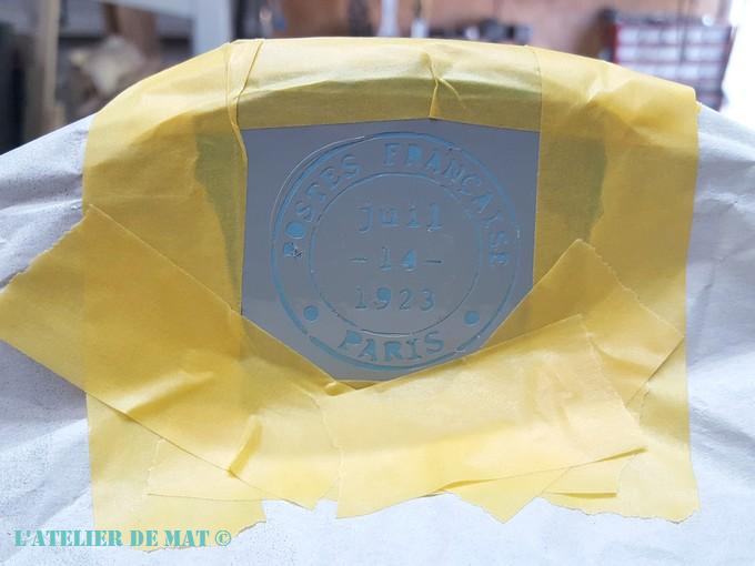 Le pochoir du cachet postal aurait peut-être mérité d’être un peu plus grand mais je l’aime bien tout de même. Il attire l’œil et remplit cette zone que je trouvais trop vide alors cela me convient. De mémoire c’est le plus petit pochoir que j’ai jamais réalisé. 😉