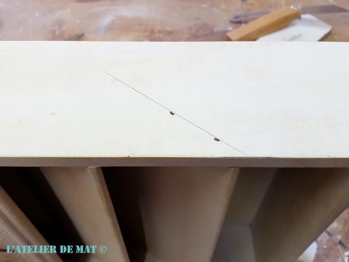 J’ai ensuite reporté celui ci sur le coté en traçant une ligne, que j’ai placée à l’œil, à ce qui devait correspondre au milieu de l’étagère.