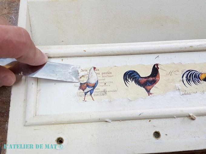 Apres quelques minutes j’ai commencé à essayer d’enlever l’image à l’aide d’une spatule. Cela a bien marché sur les bords mais le centre de l’image étant mieux collé, j’ai humidifié de nouveau celui-ci.
