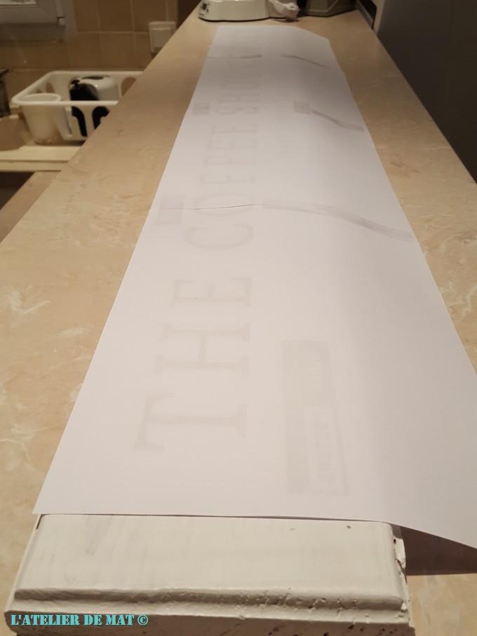 La suite va vous rappeler des souvenirs d’enfance. Cela faisait une éternité que je n’avais pas fait cela. Avec un crayon à papier, il faut passer sur chaque lettre pour transférer un peu d’encre sur la planche. Pour mon panneau, qui fait quand même plus d’un mètre de long, ça m’a pris environ 15 minutes je pense.
