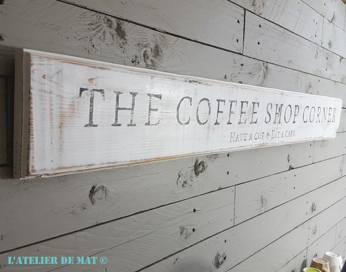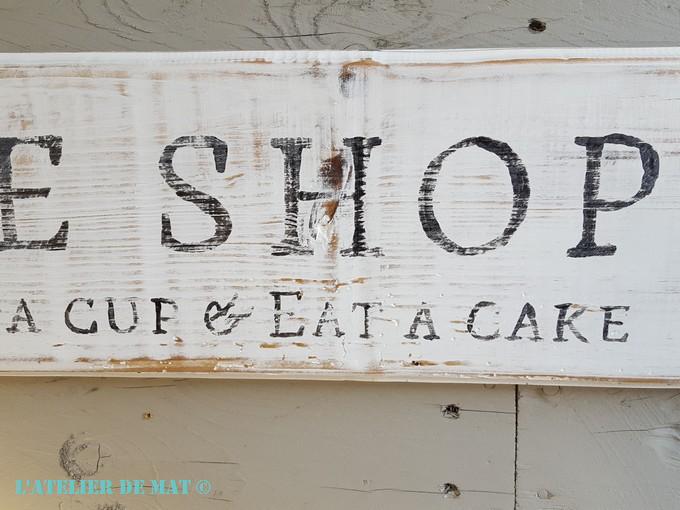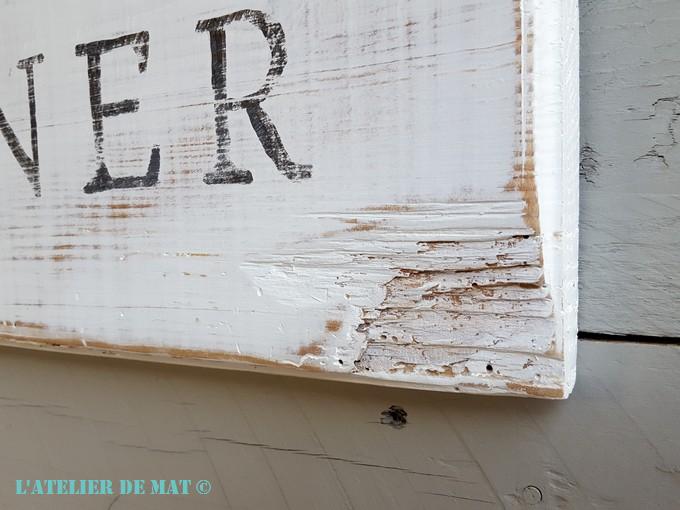 Le ponçage final permet de « gommer » pas mal de petits défauts de peinture sur le lettrage. Ça permet aussi d’amener une patine, un effet d’usure. Ce n’est pas fait exprès mais un nœud s’est révélé être juste au milieu du H, une fois le panneau fini , ce qui ajoute un charme je trouve.