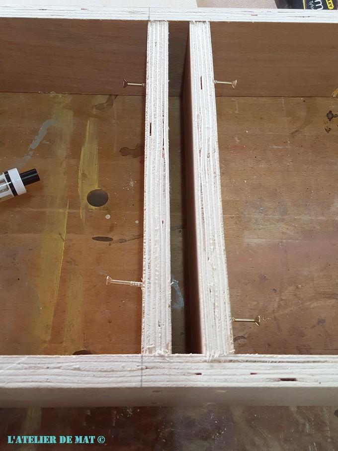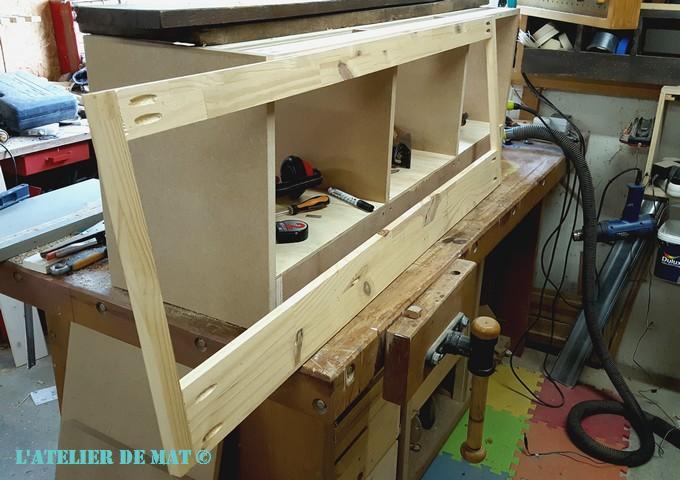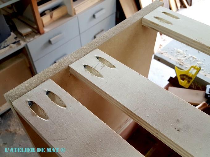 Les trois traverses s’emboîtent bien dans les emplacements prévus à cet effet. J’ai utilisé des vis de la marque « Rocket » pour les fixer, et si vous faites attention vous verrez que je n’ai pas vissé trop prés du bord. Pourquoi ? Parce que le MDF se fend qu’on on visse près d’un chant. C’est un des défauts de ce matériau. Alors si vous devez faire un meuble et utiliser du MDF, faites attention car selon la longueur de votre vis ça peut vite tourner à la catastrophe.
