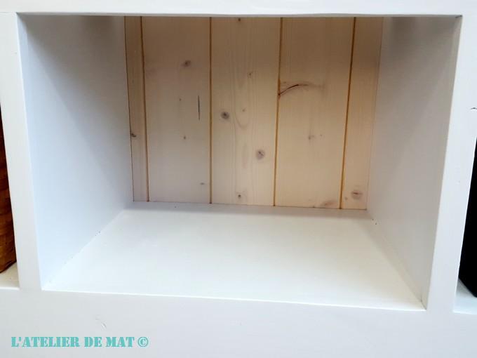 On est proche de la fin et il ne reste plus qu’à mettre un fond à notre banc. Bien que cette partie ne sera que peu visible, il ne faut pas la négliger pour autant. Et j’avais dans l’atelier le matériau parfait pour cela et qui en plus me prenait de la place : des chutes de lambris. Une fois que j’ai eu coupé les 11 lattes nécessaires, cela m’a pris cinq minutes de poser le tout au pistolet à clous. C’est un lambris déjà peint et il est moins blanc que le reste du banc mais ça s’harmonise bien non?
