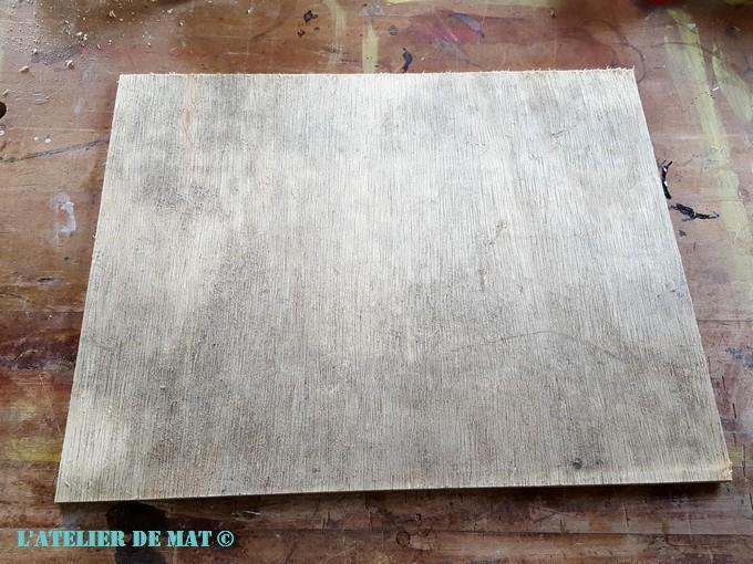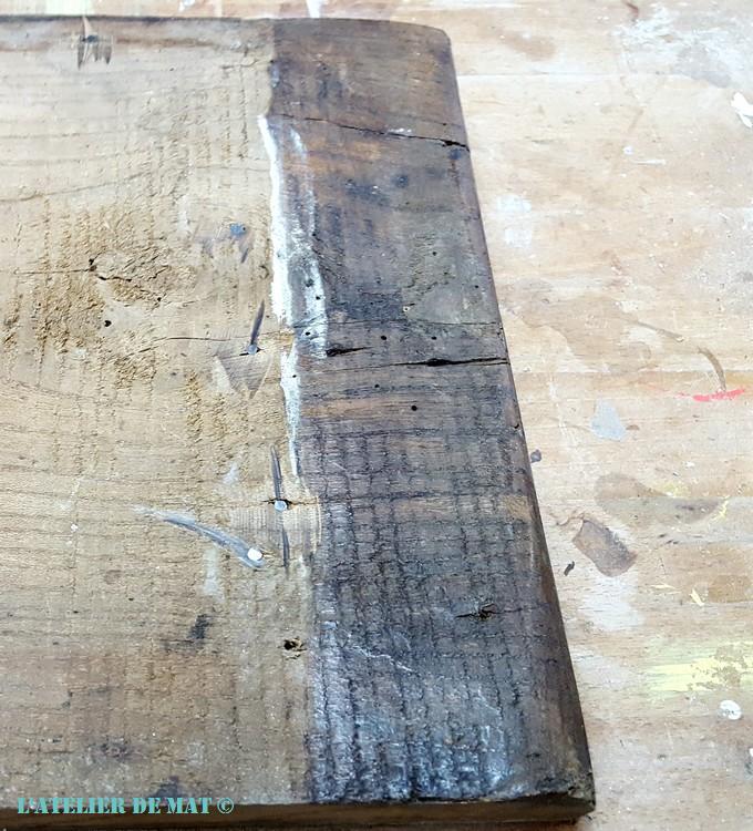 J’ai effectué ensuite un léger ponçage avec du grain 120. Je voulais juste décrasser le bois mais ne pas enlever, ni la patine ni les défauts des planches.