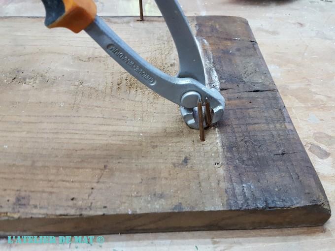 Vous pensez que je vais les couper avec la paire de tenailles hein ? Que nenni ;). En fait là, je les tire pour qu’ils rentrent un peu plus dans la planche.