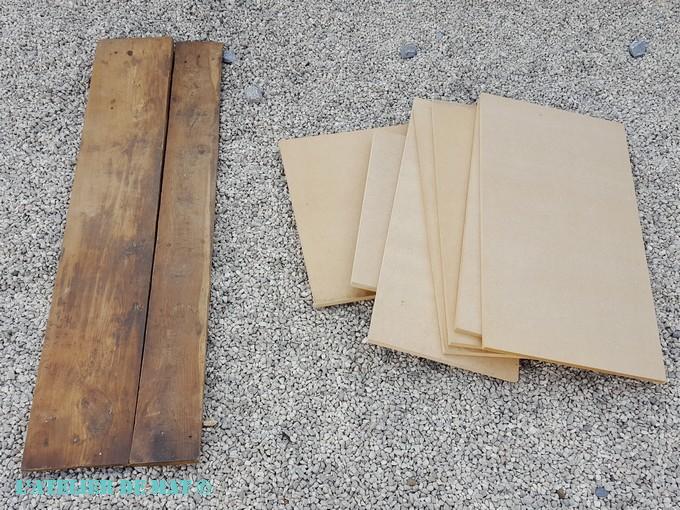 « Un banc , mais oui bien sûr un banc, pourquoi je n’y ai pas pensé plus tôt ». Voilà l’idée qui m’est venue récemment comme une révélation. Mais reprenons depuis le début. Il y a un an environ, j’ai désossé un vieux buffet basque très rustique car il était en trop mauvais état pour le relooker tel quel. Et depuis, j’avais ces deux planches à l’état quasi brut qui traînaient chez moi. Je ne savais pas quoi en faire car je voulais garder leur patine mais tout ce qui me passait par la tête nécessitait un usinage et vu le nombre de clous qu’elles avaient ce n’était pas jouable. Mais en faire un dessus de banc par contre permettrait de conserver la patine et de ne pas avoir à les usiner. Alors, quand en plus j’ai vu à côté d’elles ces morceaux de MDF, je me suis lancé.