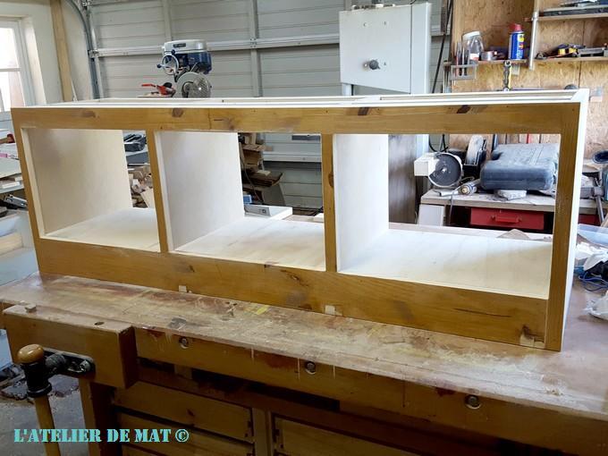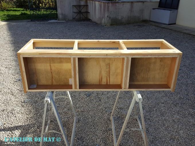 Donc 138.5cm – un rebord de 2.5 cm de chaque côté – l’épaisseur d’un montant de 19mm *2 , etc. Bref j’ai obtenu les côtes nécessaires et j’ai pu commencer la construction de la base du banc. Pour cela j’ai utilisé des chutes de contreplaqué de 18mm. Et hop encore des planches qui vont disparaître du stock. Cool !