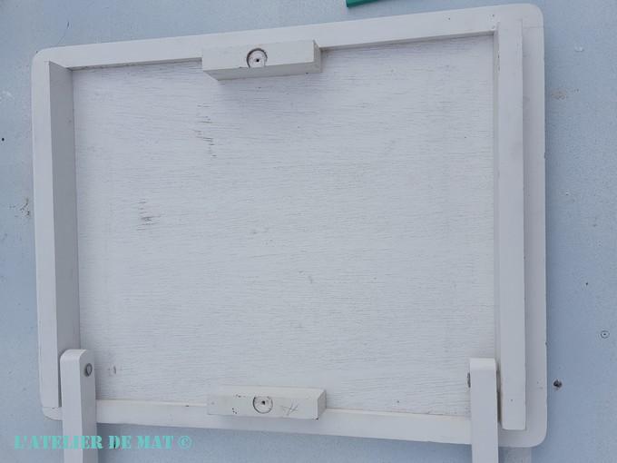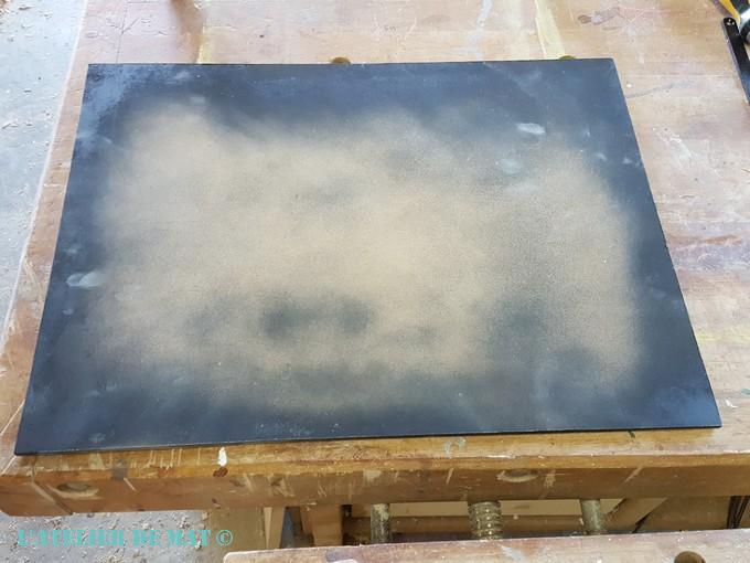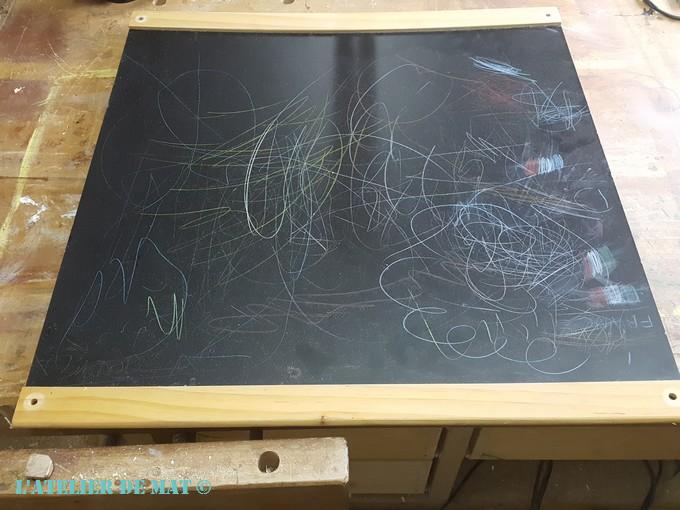 Cette matière se peint très bien et je peux aussi m’en servir comme une base lisse si je veux réaliser un collage. Quand on peut se laisser le choix, il ne faut pas hésiter. Ce vieux tableau noir d’enfant récupéré sur le trottoir est parfait pour cela. Un petit tour sur la scie sur table et c’est bon.