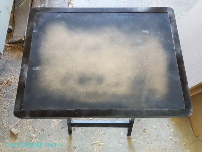 Après avoir nettoyé la desserte, je me suis rendu compte que la peinture d’origine n’était pas en bon état. Alors toujours dans l’optique de me laisser le plus d’options possibles pour la finition finale, j’ai passé un coup de bombe noire sur une majeure partie de la table. D’ici je vois certains d’entre vous lever un sourcil interrogateur alors je m’explique : si pour la finition je veux donner un effet « usé » à la desserte un peu comme sur cette table , je pourrais le faire et du noir ressortira sous la peinture de finition.