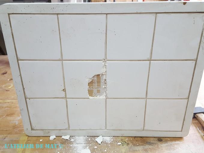 Comme vous pouvez le voir, certains carreaux se sont décollés facilement mais d’autres ont été plus durs à enlever. Cela à pour conséquence d’avoir abimé le panneau de contreplaqué. Ce n’est pas très grave car comme il est très fin, j’avais déjà prévu de le renforcer.