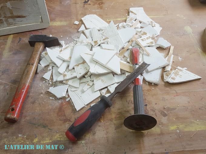 Cela nous amène donc au plan B. Aucun carreau n’a de jeu et il va falloir utiliser la méthode forte et les casser. Ici j’ai commencé par le milieu avec un marteau assez fin pour créer une brèche. Cela m’a permis ensuite d’utiliser ou le burin ou le vieux ciseau à bois à tour de rôle. Le panneau de bois étant fin je ne pouvais pas taper trop fortement.