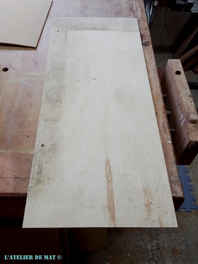 Maintenant que le dessous est réglé , il faut s’occuper du dessus. Ne sachant toujours pas à ce moment quelle sera la finition du plateau, j’ai opté pour du MDF.