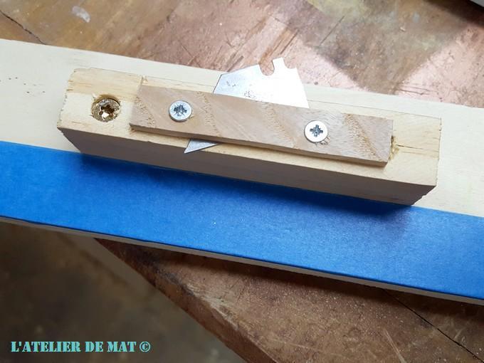 Afin d’avoir une coupe bien droite, je me suis fabriqué rapidement ce petit outil. C’est beaucoup plus pratique que d’utiliser un cutter et une règle. Le tasseau représente la largeur entre le bord de la desserte et le papier peint. Il suffit de plaquer contre le bord du plateau et le tour est joué.