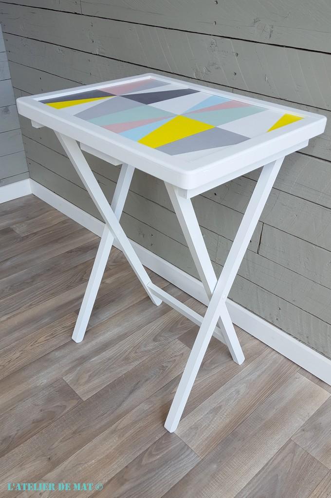 Après une petite pause d’une semaine, ce weekend j’ai pu trouver un créneau pour finir. J’ai repeint la table en blanc de nouveau. Je trouve que c’est la couleur qui lui ira le mieux avec la finition que j’ai choisie pour le plateau : un papier peint graphique !