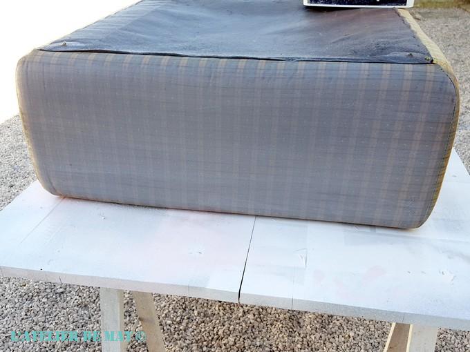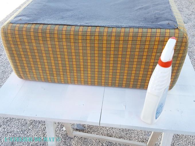 Je vais déhousser le coussin de l’ottomane et je vais voir ce qu’il en est. Avec l’eau que j’ai vaporisé dessus lors de la mise en peinture je vais vite voir s’il y a de la moisissure.