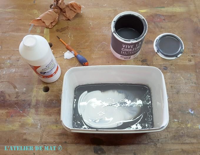 Dans un vieux sceau j’ai mis ma dose de peinture à laquelle j’ai ajouté 1/3 de la bouteille de médium. Celle-ci indiquait bien qu’il fallait faire un mélange à 50/50 entre médium et peinture donc j’ai respecté les indications. Au départ les deux produits ont eu du mal à se mélanger mais à force de touiller j’ai obtenu quelque chose d’homogène.