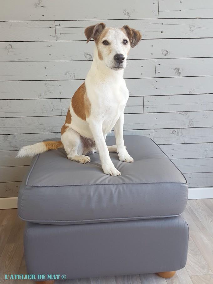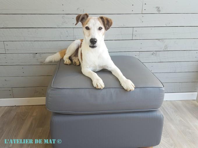 De mon côté je suis plutôt satisfait du résultat et surtout de la facilité de mise en œuvre. Toutefois il faut avouer que l’aspect général bien que très sympa n’est pas 100% comparable à un vrai tissu. Le toucher est agréable ainsi que l’assise mais cela brille un peu. Ce détail est sûrement dû au fait que j’ai utilisé une peinture au fini satin. La prochaine fois j’achèterai une peinture en finition mat pour éviter cela. Pour le coup j’ai ici un pouf à chiens 😉 qui m’aura coûté qu’une dizaine d’euros.