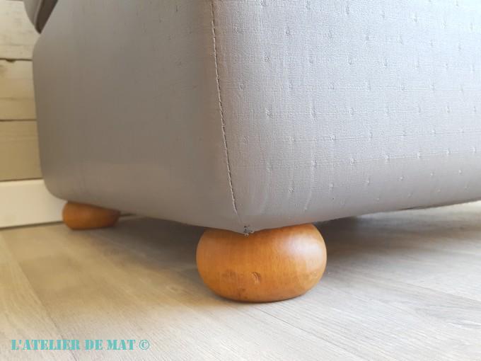 Pendant que la deuxième couche séchait, j’ai eu le temps de m’occuper des pieds. Dans un premier temps j’avais envisagé de les peindre en blanc mais je me suis ravisé au dernier moment. D’une part je n’avais pas envie de me galèrer à peindre des boules au pinceau et je n’avais pas envie de sortir le pistolet à peinture pour si peu non plus , d’autre part j’ai surtout craint que le blanc dénote trop avec la couleur « gris ardoise » de l’ottomane.