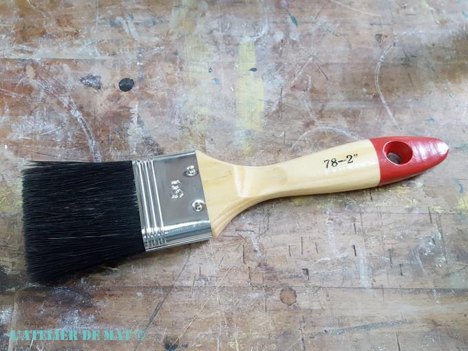 Pour ce qui est de l’application, je vais utiliser ce pinceau que j’ai trouvé chez Action pour la somme exorbitante de 1€. Il fait 50 mm de large ce qui est assez pour faire les parties plates mais en même temps assez fin pour les recoins.