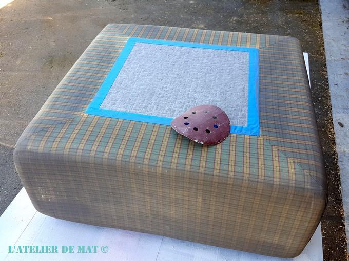 Après m’être donc acquitté des tâches du jardin, déloger à tour de rôle Thor (mon vieux chien squatteur de canapés) et un de mes fils de dessus , j’ai pu extraire l’ottomane du salon et je me suis installé dehors. Dans un premier temps j’ai démonté les pieds puis je me suis collé à la préparation de la peinture.