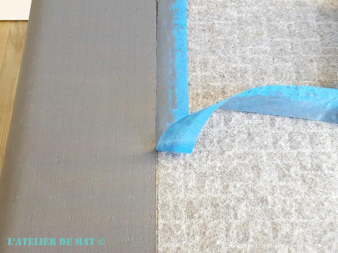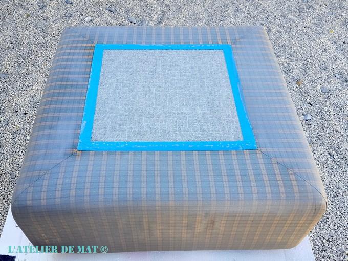 J’ai continué sur les trois autres faces puis j’ai protégé les bords de la partie centrale ,avec mon scotch de masquage préféré ,afin que le tissu type « Velcro » soit protégé. Sur cette image vous pouvez voir que je n’ai pas rigolé avec le pulvérisateur, j’ai presque noyé le truc ;).