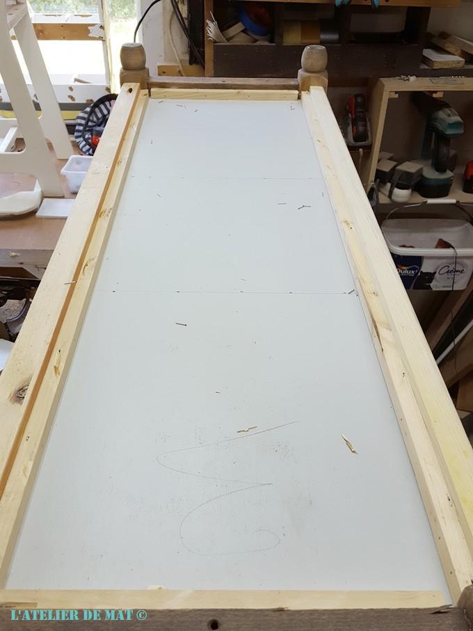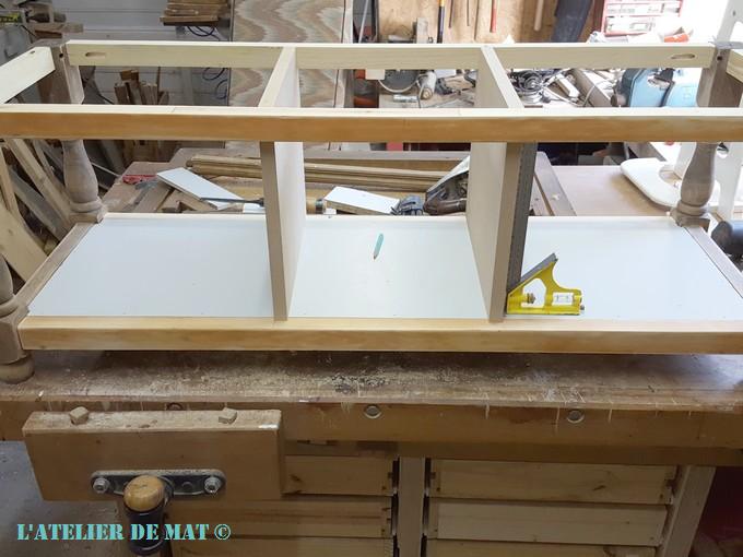 Il ne me reste plus qu’a préparer deux petits tasseaux pour cacher les chants des séparations en MDF. Je trouve que cette solution est plus rapide et plus esthétique que de devoir enduire les chants de MDF avant la phase de peinture. Ici j’ai utilisé des montants d’un vieux tableau noir pour enfant que j’ai trouvé à la poubelle. N’ayant besoin que de 30 cm c’était juste parfait.