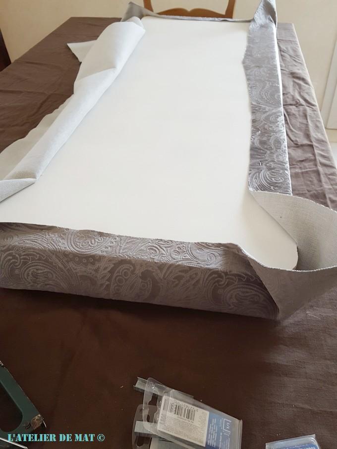 Il ne reste désormais plus qu’à faire le garnissage de l’assise. Vous pouvez voir le dos du panneau que j’ai pris le temps de peindre. Je ne détaille pas plus que ça la méthode pour fixer le tissu car j’ai déjà abordé celle-ci dans l’article Seconde vie d’une chaise trouvée à la poubelle. Ici c’est juste un peu plus long à réaliser.