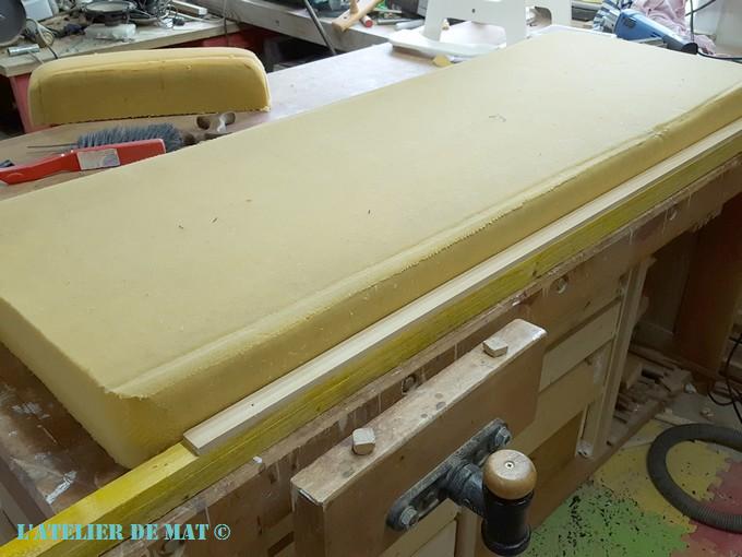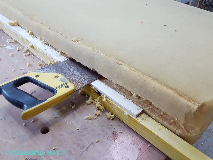 Après l’avoir coupée en longueur, je l’ai posée sur le banc pour avoir un aperçu du rendu. Cela faisait trop épais et je n’avais pas d’autre épaisseur en réserve. Alors j’ai tenté un truc à la McGyver. J’ai cloué un tasseau de l’épaisseur à enlever de chaque côté de la mousse afin de me donner une guide de référence