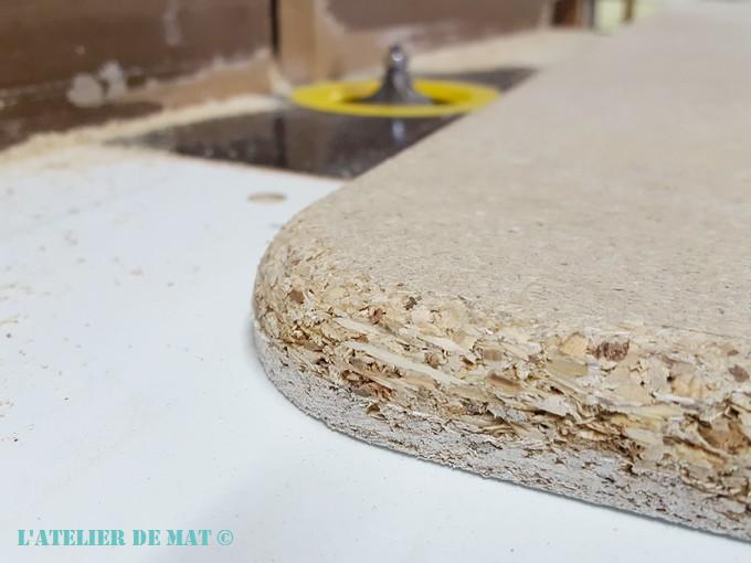 J’ai terminé la préparation de l’assise du banc en passant le panneau à la défonceuse afin que le bord inférieur soit arrondi. Cela va rendre l’esthétisme de l’assise plus joli mais surtout cela évitera de déchirer le tissu lors sa mise en place.